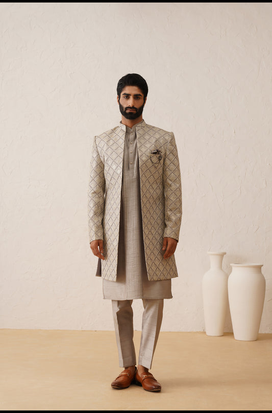 Golden Sequins And Resham Embroidered Indowestern On Silk