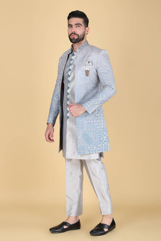 Grey Ombre Thread And Sequins Embroidered Indowestern