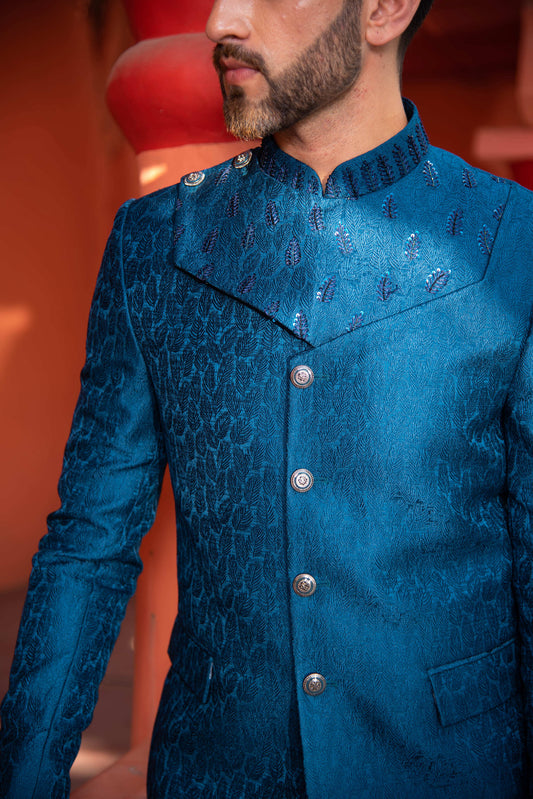 Blue Sequins Embroidered Bandhgala on Woven silk