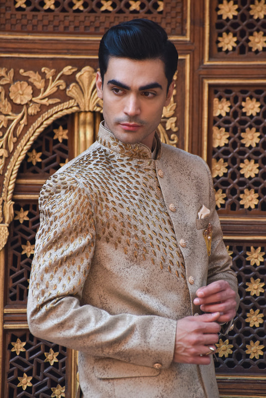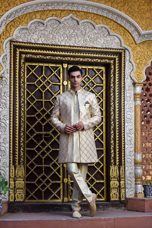 Light Golden Cutdana Embroidered Bandhgala On Italian Fabric