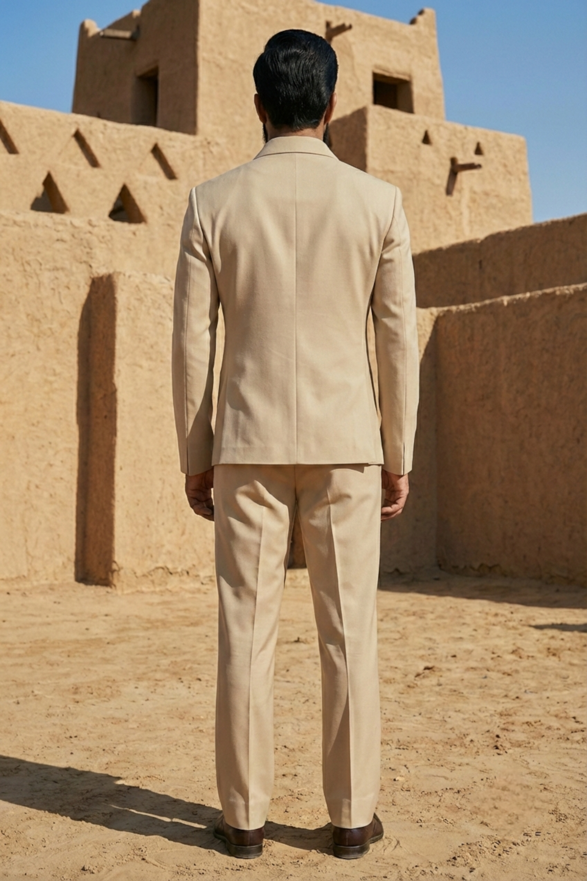 Elevate your celebration wardrobe with this masterfully tailored sand-colored Shacket Set. Blending contemporary art with structured menswear, this jacket features intricate, bespoke-style embroidery of a regal crane set against abstract geometric grids and delicate branch motifs. The crisp collar, sleek button-down front, and welt pocket offer a sharp, modern silhouette, making it an incredible choice for the gentleman who values wearable art.