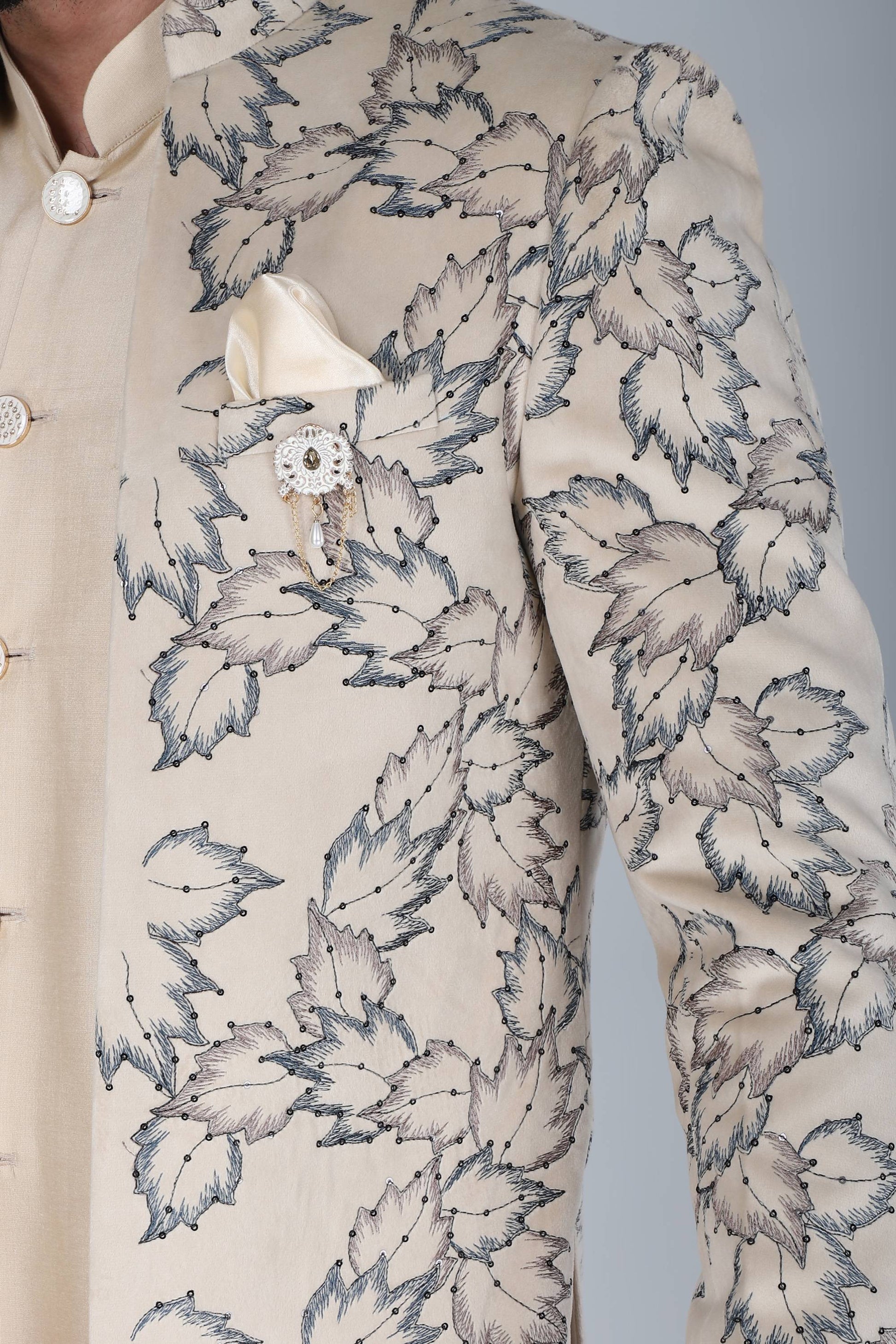 Step into luxury with this elegant Cream Thread and Sequins Embroidered Short Indowestern on Velvet – 3-Piece Set. Crafted for refined celebrations, this premium ensemble includes a short kurta, matching trouser, and a beautifully embroidered jacket, making it the perfect choice for weddings, receptions, and festive gatherings.The rich velvet jacket is adorned with delicate thread and sequin embroidery, adding a subtle shimmer to its luxurious texture. A unique patchwork detail at the bottom of kurta enhances the design with a handcrafted touch. Paired with a tailored trouser for all-day comfort ,this outfit strikes the perfect balance between traditional charm and modern sophistication.