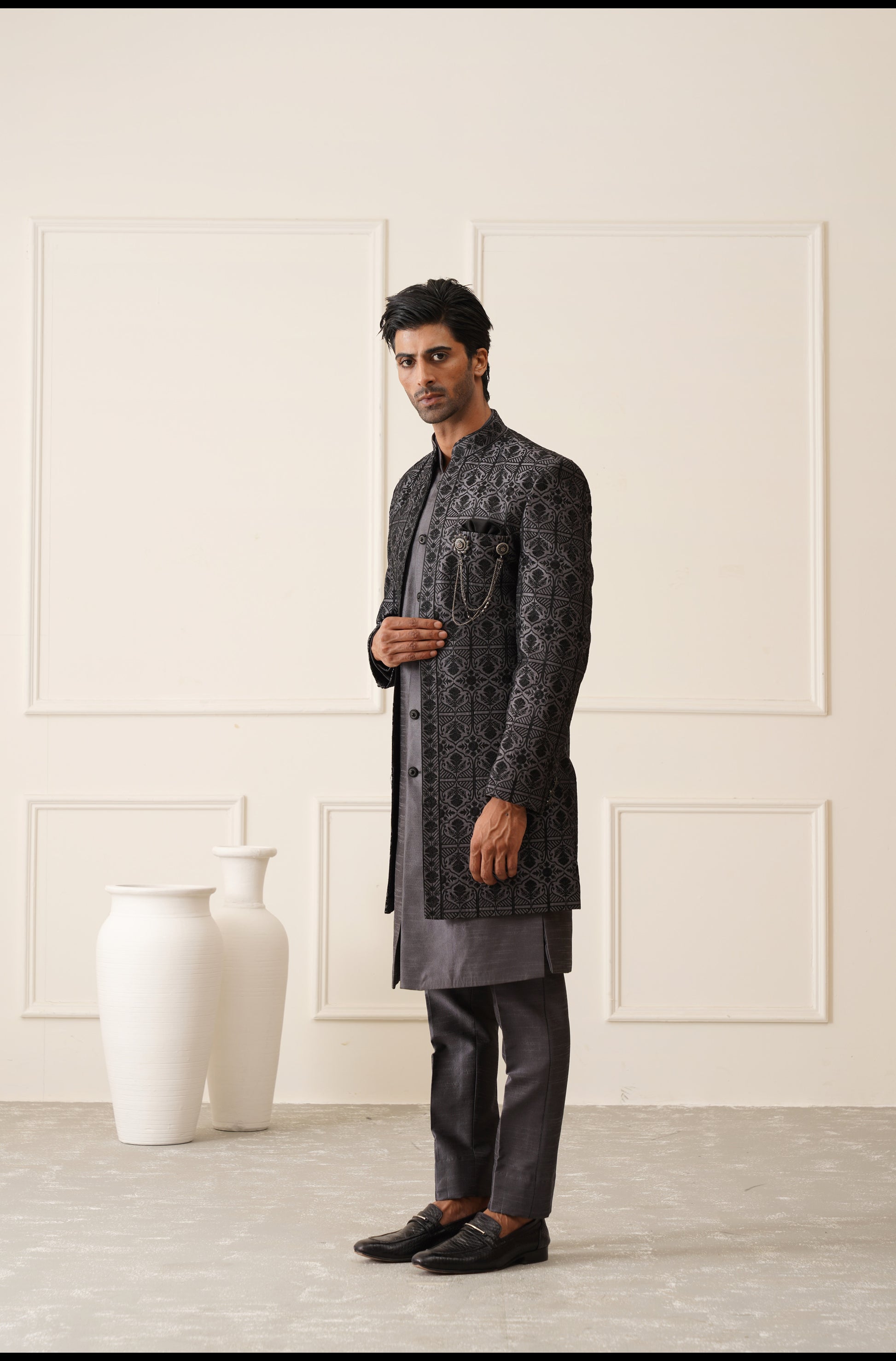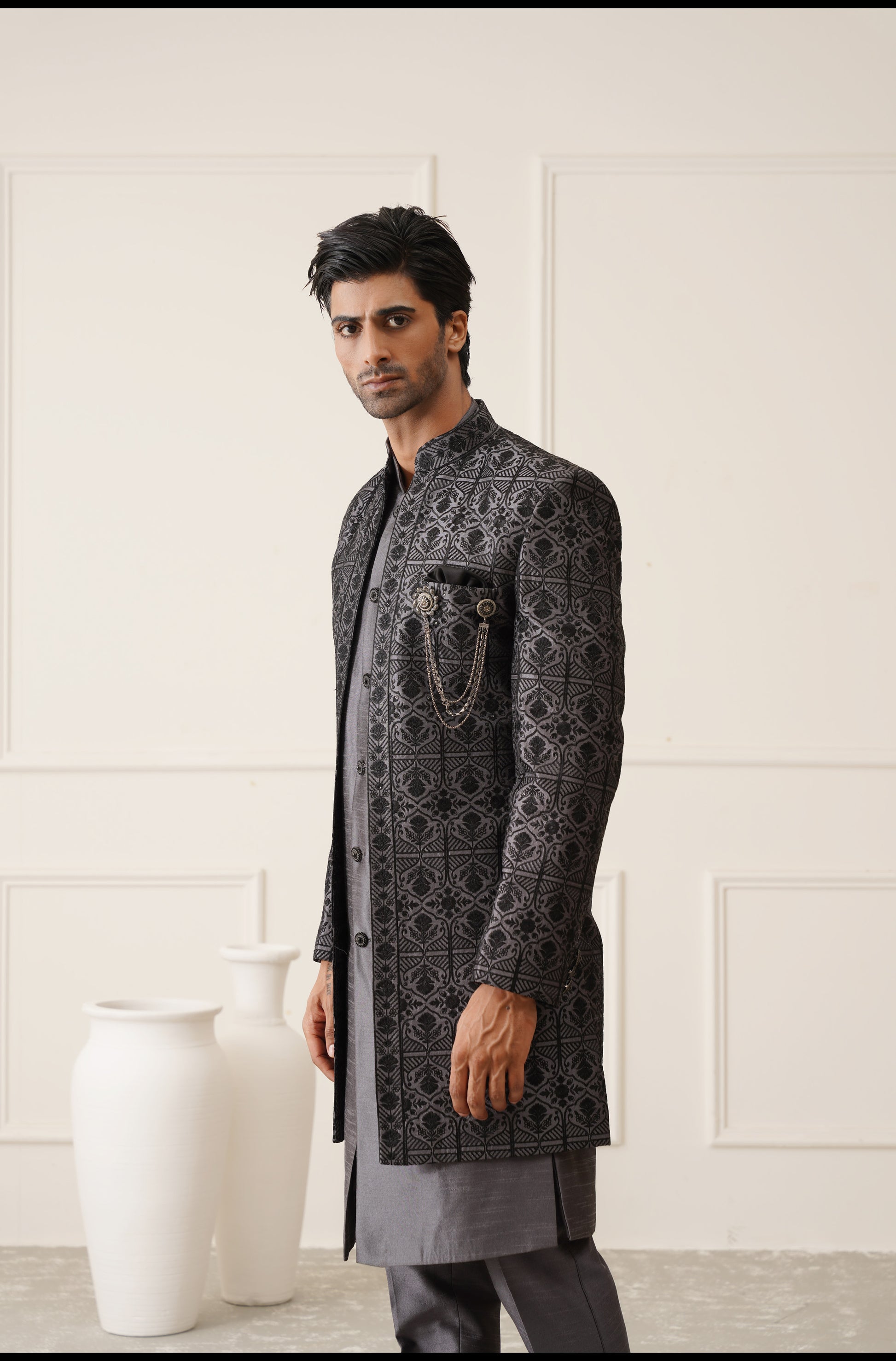 Dark Gray Thread Embroidered Open Indowestern Set