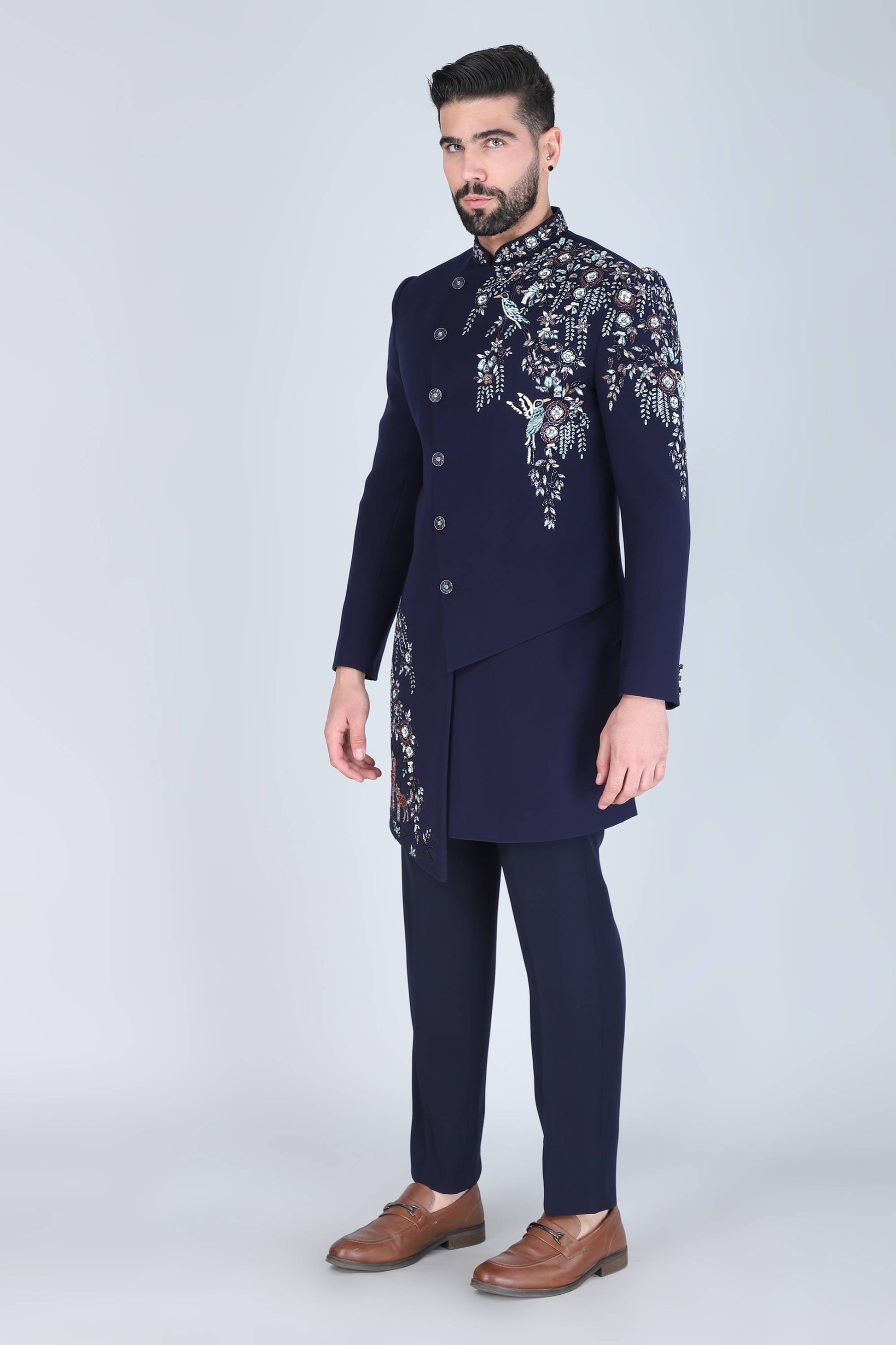 Navy Blue Hand Embroidered Designer Indowesern On Suiting Fabric