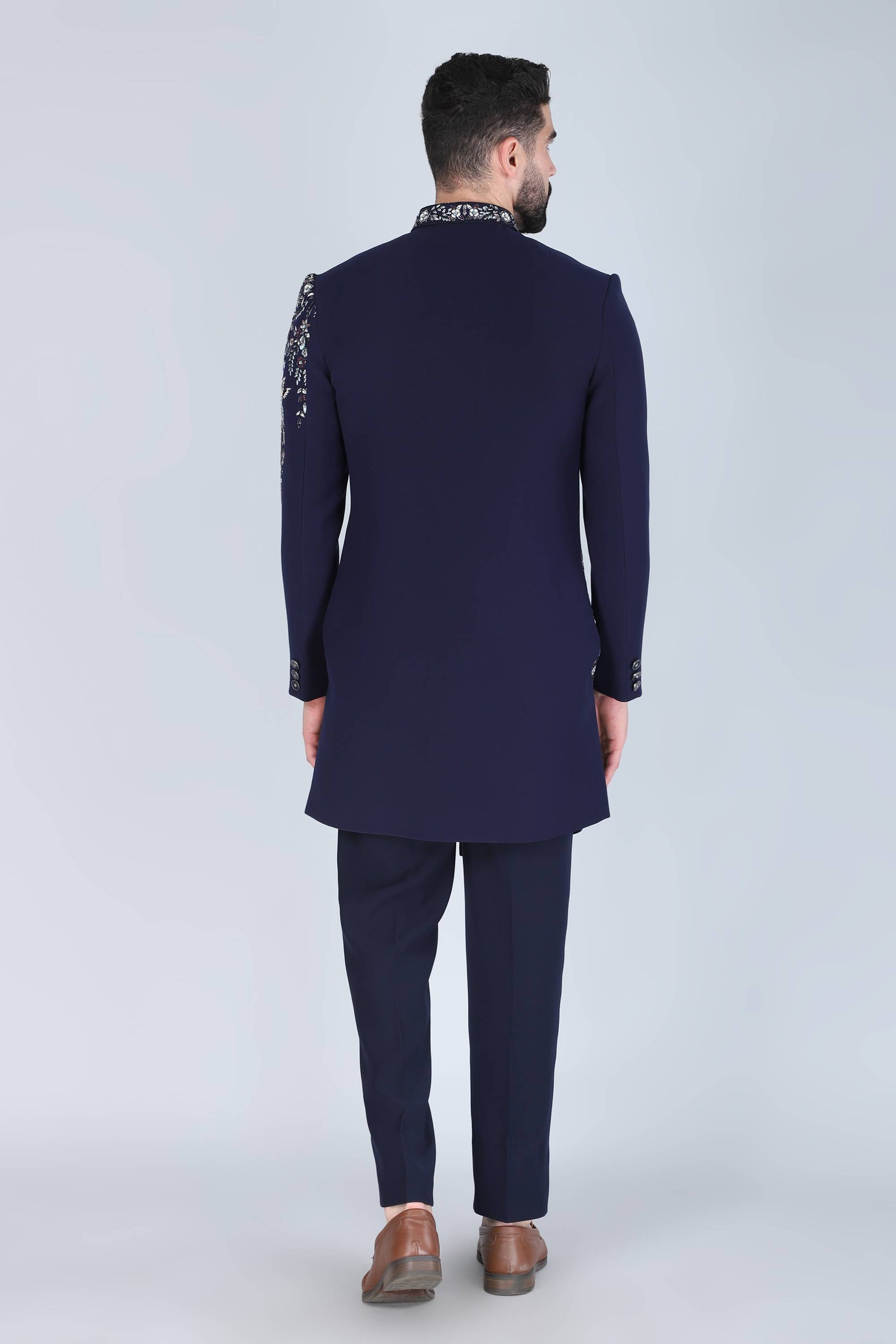 Blue Sequins Embroidered Bandhgala on Woven silk