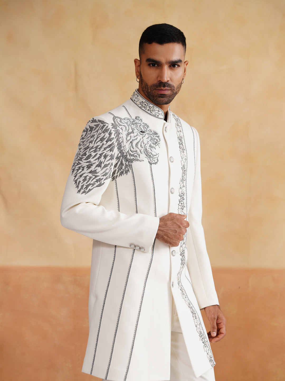 The subtle off-white hue enhances the elegance of the intricate detailing, making it perfect for weddings, receptions, festive occasions, and upscale gatherings. Designed with a contemporary Indo-Western silhouette, the outfit offers a perfect balance of tradition and modernity.